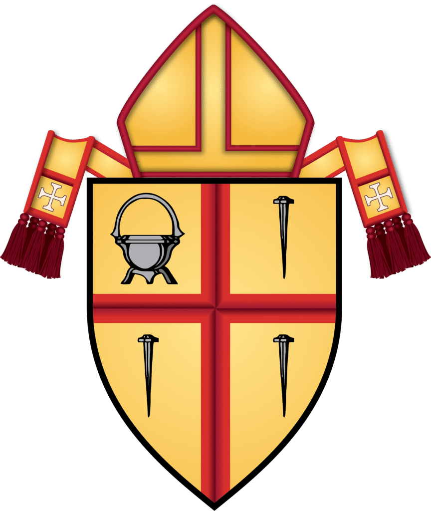 The coat of arms combines symbols that reflect Bishop Bejarano’s spiritual life and priestly ministry. The main part of the shield shows four wavy vertical lines on a gold background. These represent flowing waters. This alludes to his chosen motto and also symbolizes the graces that come from the Divine life to quench our thirst for God. The upper third of the shield is red because it is borrowed from the coat of arms of the Order of Mercy, of which the Bishop’s patron saint, Raymond Nonnatus, was a member. The central symbol resembles a monstrance because St. Raymond is often depicted holding one. The Eucharist is Bishop Bejarano’s inspiration for his vocation. It was through the Eucharist that he received his call to the priesthood at age seven and which keeps his faith and his ministry going. It represents the call to offer oneself as a living sacrifice. The monstrance is flanked on either side by an image of the Sacred Heart, alluding to the mercy of God and echoing the idea of a sacrificial offering of oneself united to the sacrifice of Christ, and of a rose for Our Lady. It is an allusion to Our Lady of Guadalupe, patroness of the Americas, and highlights the bishop’s Hispanic heritage.