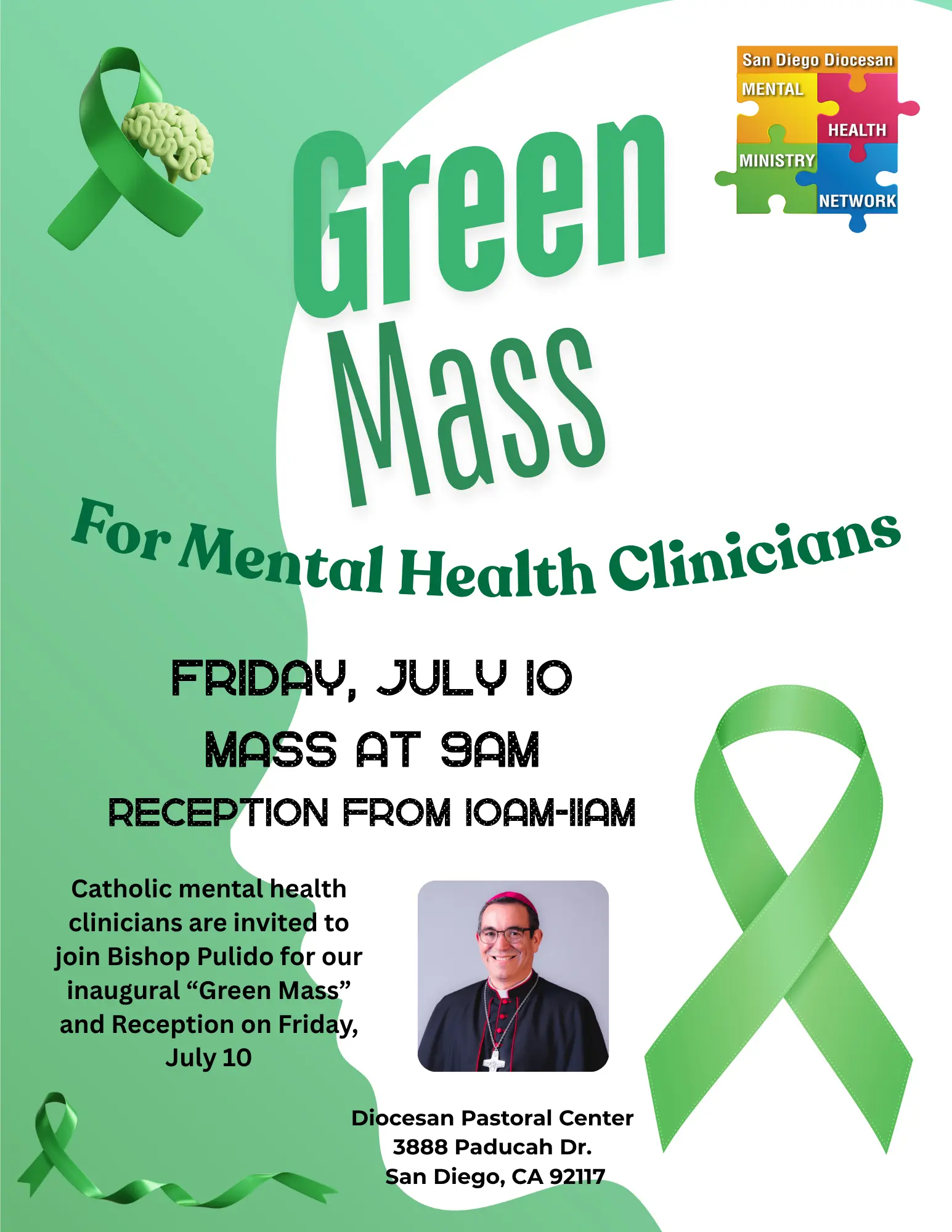 Con motivo del Mes de la Concienciación sobre la Salud Mental, invitamos a todos los profesionales de la salud mental y terapeutas católicos a unirse al obispo Felipe Pulido y a la Red de Pastoral de la Salud Mental en nuestra primera «Misa Verde» y recepción, que tendrá lugar el viernes 10 de julio a las 9:00 h en el Centro Pastoral Diocesano. El objetivo de la misa es brindar a nuestros terapeutas y profesionales de la salud mental católicos la oportunidad de reunirse con el obispo en oración, solidaridad y apoyo mutuo. (El verde es el color tradicional de las iniciativas de prevención y concienciación sobre la salud mental).