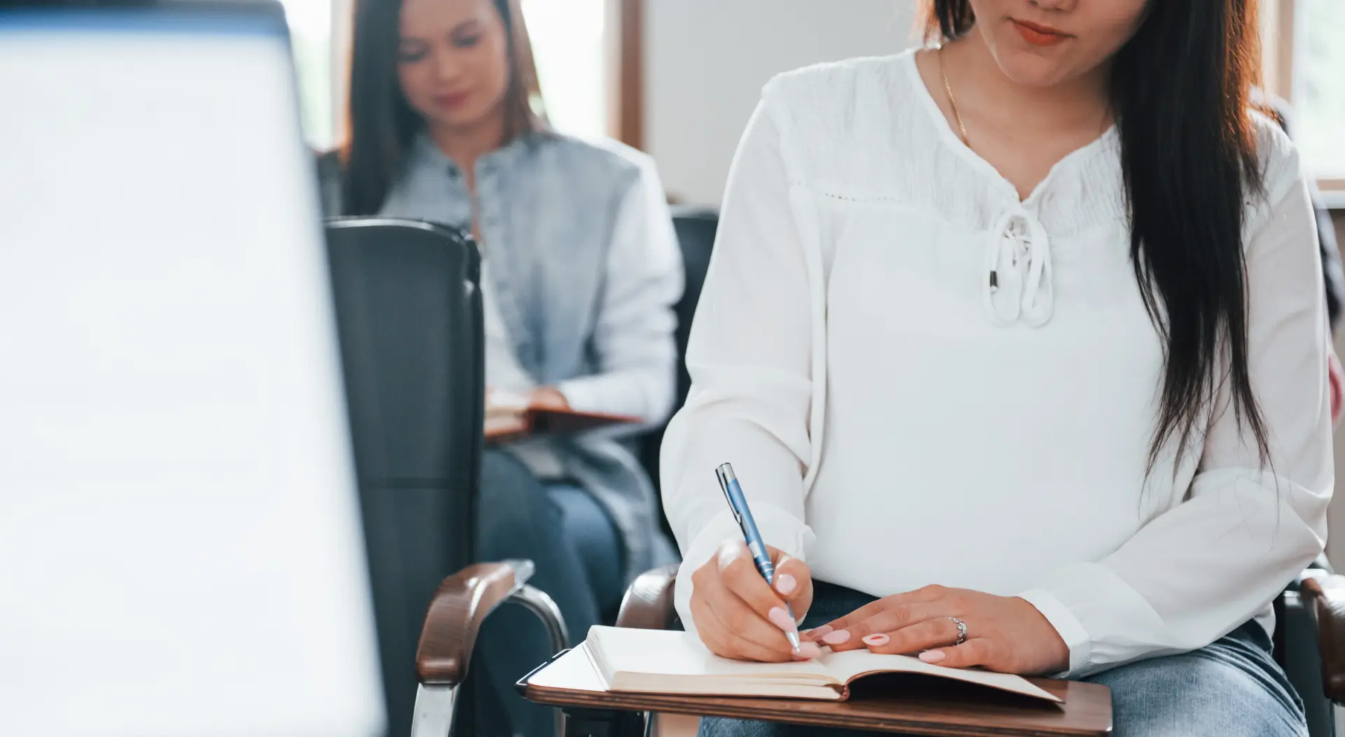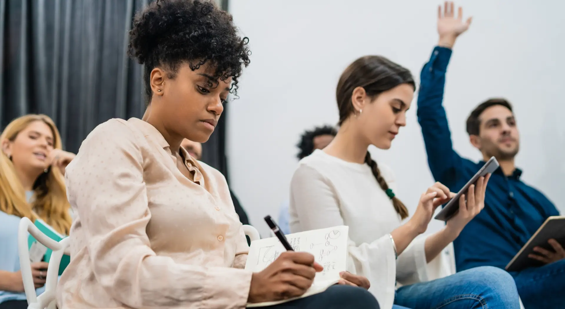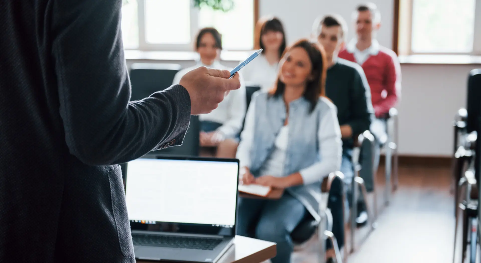 A group of people seated at tables in a classroom setting while a speaker stands at the front, gesturing. A person in a mask is visible in the background, and a table with items is in the foreground.