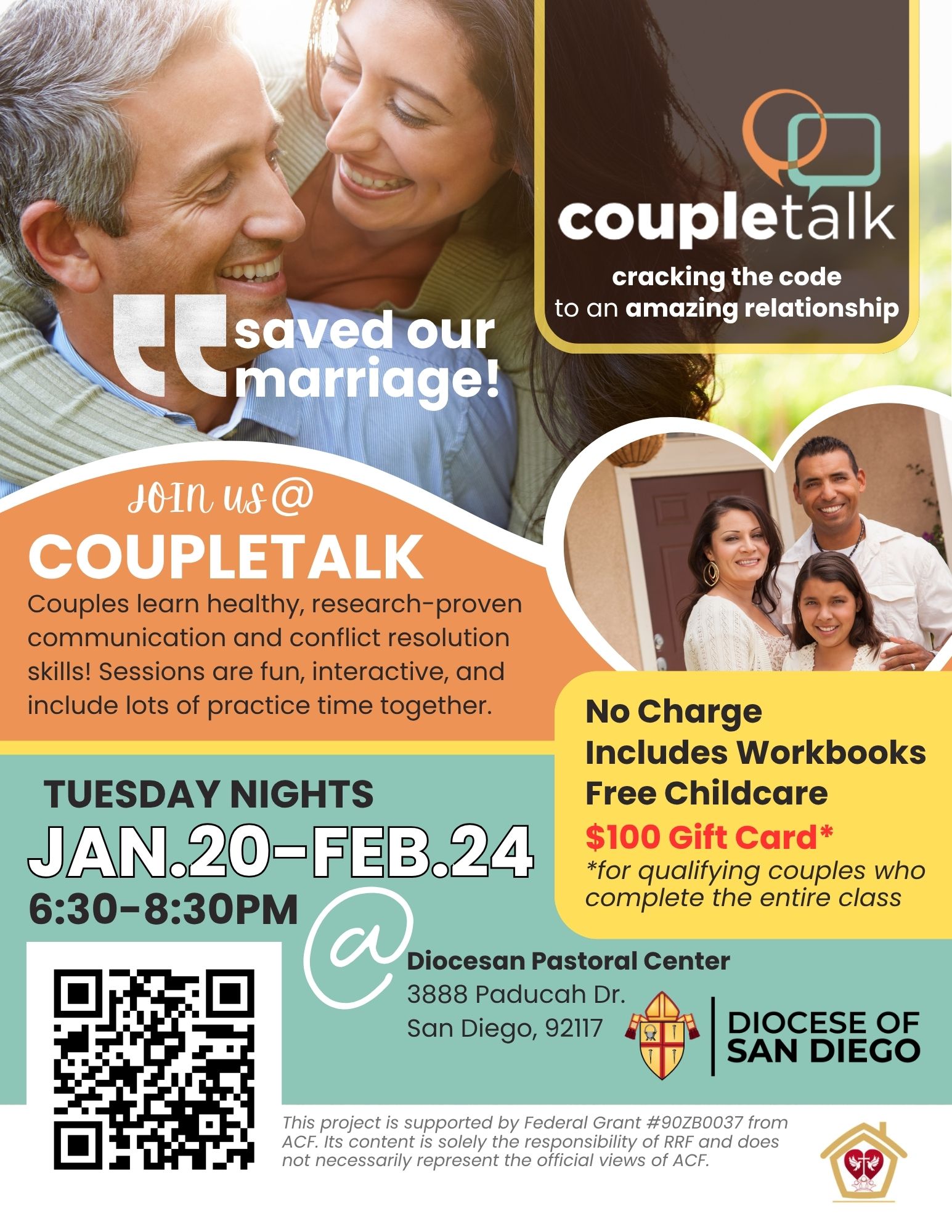 Couple Talk is a marriage enrichment workshop series that focuses on helping couples develop research-proven skills for healthy communication and conflict resolution. Sessions are fun, interactive, and include lots of practice time together. Sessions are completely free, including workbooks, and childcare! Finally, couples who complete the entire class will receive a $100 gift card. Couples can register at https://usrelationships.org/diocesesd/.