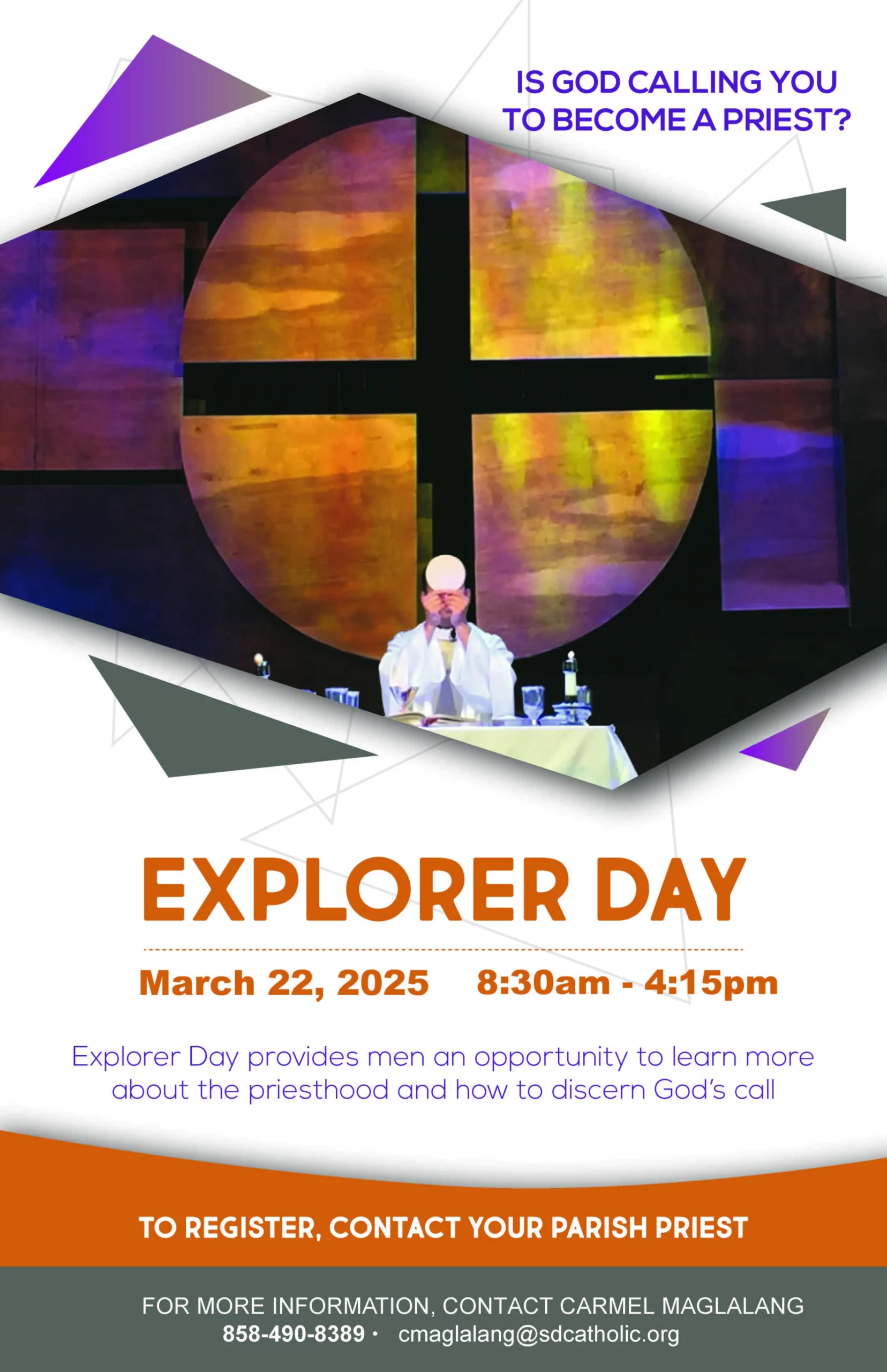 On Saturday, March 22, 2025 the Diocese of San Diego is hosting an Explorer Day with Bishop Ramón Bejarano for those men who are interested in exploring a possible vocation to the priesthood. The day will be held at St. Francis Center on the campus of the University of San Diego from 8:30 a.m. to 4:15 p.m. If living a life of service for Christ and the people of God is attractive to you, take advantage of the opportunity to attend this upcoming Explorer Day. Pick up an application at your parish office or call St. Francis Center at (858) 490-8389.
