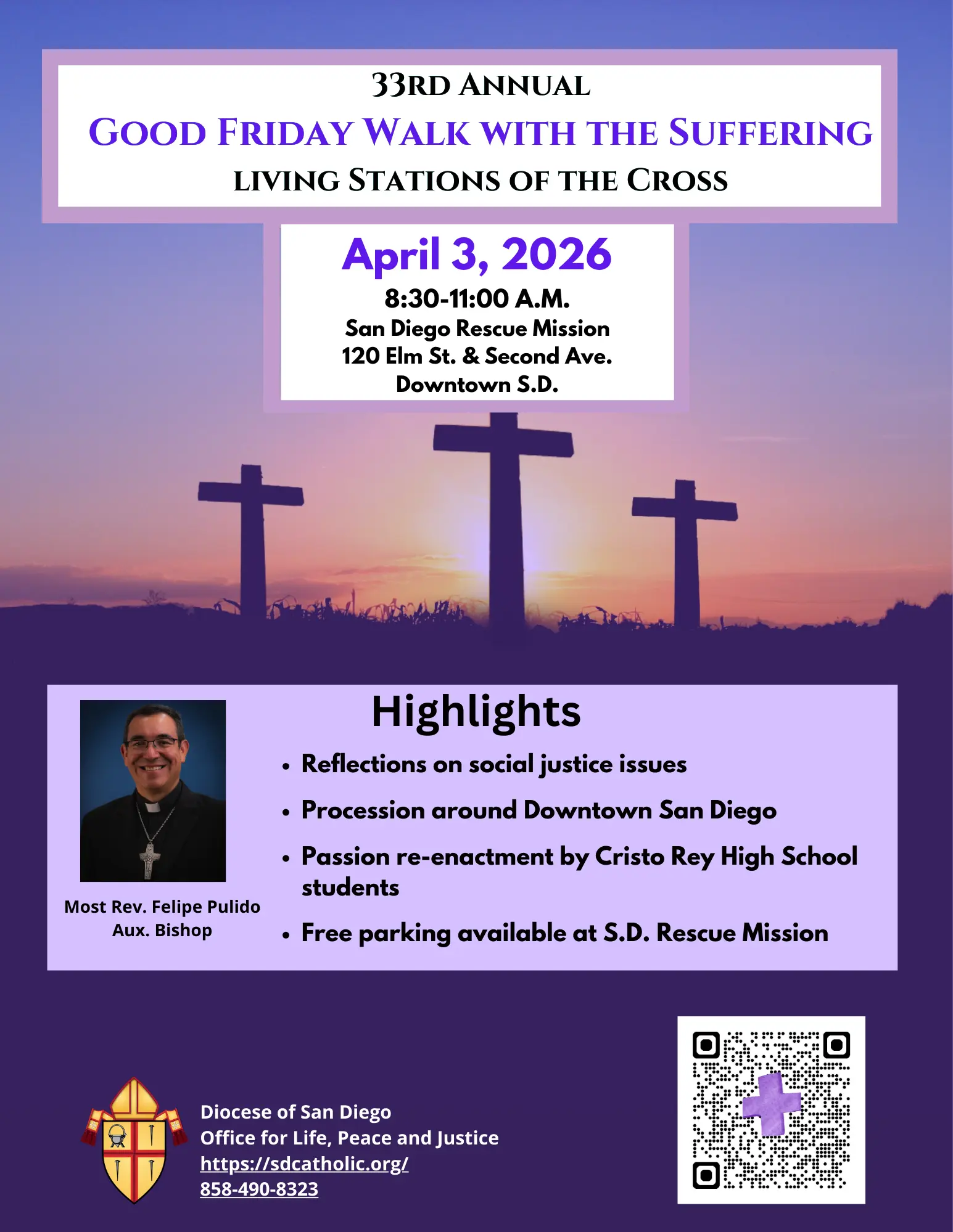Join Bishop Felipe Pulido to accompany Jesus to Calvary and reflect on social justice issues such as poverty, immigration, and mental health.