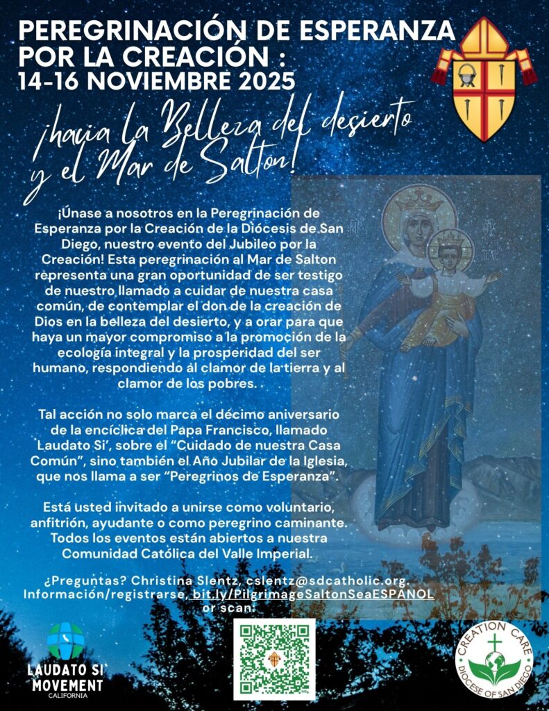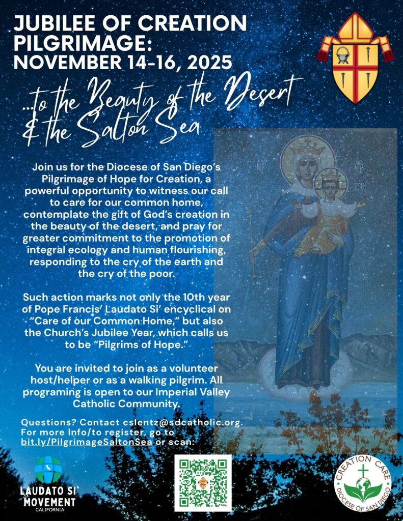 Join us for the Diocese of San Diego’s Pilgrimage of Hope for Creation, a powerful opportunity to witness our call to care for our common home, contemplate the gift of God’s creation in the beauty of the desert, and pray for greater commitment to the promotion of integral ecology and human flourishing, responding to the cry of the earth and the cry of the poor.