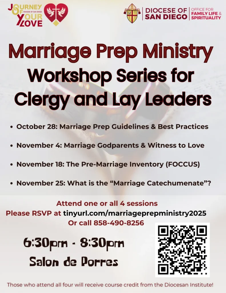 Clergy, deacons, and lay leaders involved in marriage preparation are invited to attend one or all sessions of our marriage prep ministry workshop series. These workshops are intended to provide formation for marriage prep leaders in the areas of ministering to, accompanying, evangelizing, and providing pastoral care to engaged couples during the marriage preparation process. Offered simultaneously in English and Spanish.
