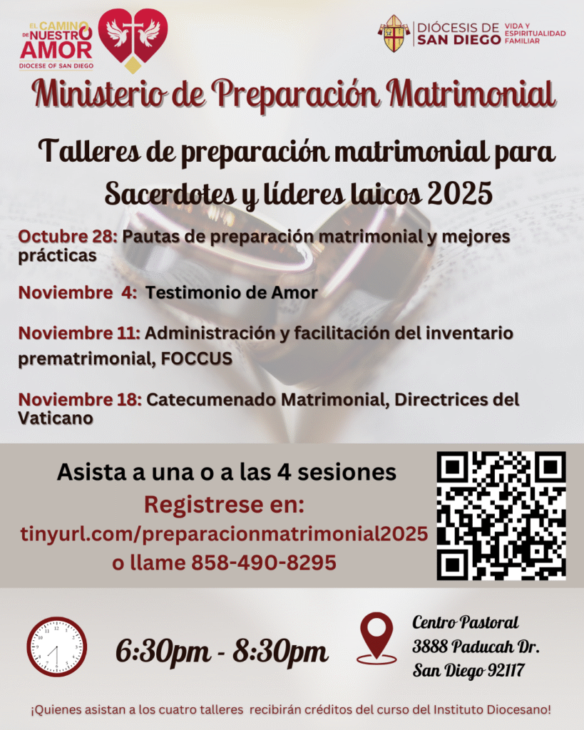 El clero, los diáconos y los líderes laicos involucrados en la preparación matrimonial están invitados a asistir a una o todas las sesiones de nuestra serie de talleres del ministerio de preparación matrimonial. Estos talleres están destinados a brindar formación a los líderes de preparación matrimonial en las áreas de ministrar, acompañar, evangelizar y brindar atención pastoral a las parejas comprometidas durante el proceso de preparación matrimonial. Se ofrece simultáneamente en inglés y español.