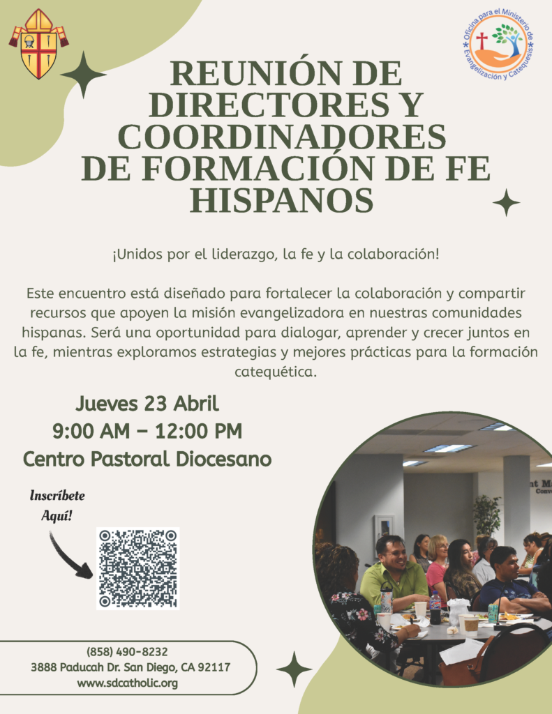 Este encuentro está diseñado para fortalecer la colaboración y compartir recursos que apoyen la misión evangelizadora en nuestras comunidades hispanas. Será una oportunidad para dialogar, aprender y crecer juntos en la fe, mientras exploramos estrategias y mejores prácticas para la formación catequética.