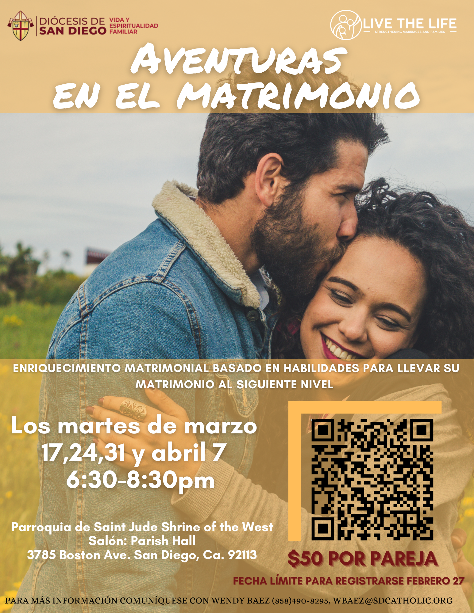 Les invitamos a nuestro próximo taller de aventuras en el matrimonio que sera los martes de marzo 17,24,31 y abril 7 de las 6:30 pm a 8:30 pm. Para registrarse, presione aquí.