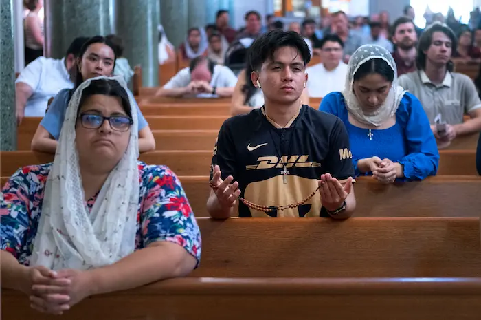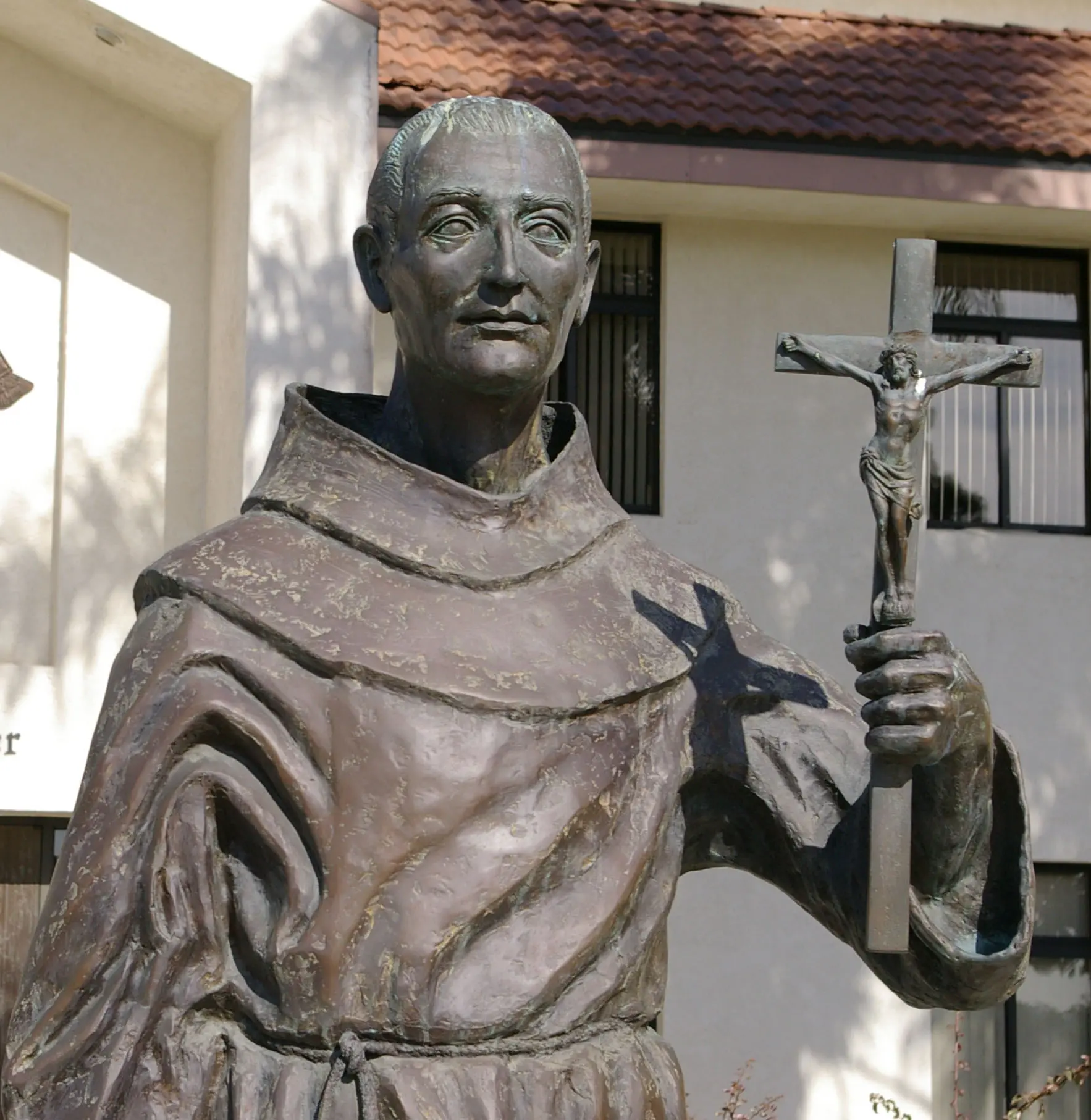 The coat of arms combines symbols that reflect Bishop Bejarano’s spiritual life and priestly ministry. The main part of the shield shows four wavy vertical lines on a gold background. These represent flowing waters. This alludes to his chosen motto and also symbolizes the graces that come from the Divine life to quench our thirst for God. The upper third of the shield is red because it is borrowed from the coat of arms of the Order of Mercy, of which the Bishop’s patron saint, Raymond Nonnatus, was a member. The central symbol resembles a monstrance because St. Raymond is often depicted holding one. The Eucharist is Bishop Bejarano’s inspiration for his vocation. It was through the Eucharist that he received his call to the priesthood at age seven and which keeps his faith and his ministry going. It represents the call to offer oneself as a living sacrifice. The monstrance is flanked on either side by an image of the Sacred Heart, alluding to the mercy of God and echoing the idea of a sacrificial offering of oneself united to the sacrifice of Christ, and of a rose for Our Lady. It is an allusion to Our Lady of Guadalupe, patroness of the Americas, and highlights the bishop’s Hispanic heritage.