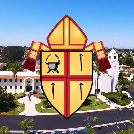 Bishop Pham’s coat of arms combines the Diocese of San Diego’s coat of arms on the left side, and his on the right. On his, a red boat on a blue ocean sits on diagonal lines suggesting a fisherman’s net. This symbolizes his ministry as a “fisher of men,” as well as how his own father had been a fisherman. The boat is also a symbol of the Church, which is referred to as the “barque of Peter.” At the center of the sail is a red beehive (a symbol of the bishop’s baptismal patron saint, St. John Chrysostom, known as a “honey-tongued” preacher). The beehive is surrounded by two green palm branches (an ancient symbol of martyrdom; the bishop’s ancestors were among Vietnam’s first martyrs). The eight red tongues of fire around the boat are a symbol of the Holy Spirit and a representation of the diversity of ethnic communities.